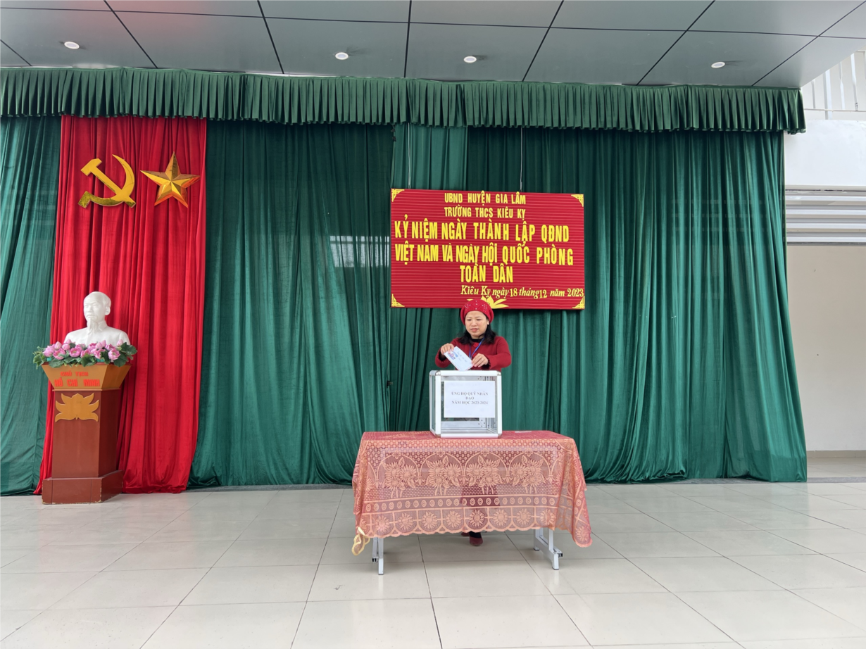 Thực hiện thư ngỏ của Hội Liên hiệp phụ nữ xã Kiêu Kỵ kêu gọi hỗ trợ “Chương trình đồng hành cùng phụ nữ biên cương” và cuộc vận động ủng hộ quỹ nhân đạo của trường THCS Kiêu Kỵ nhằm giúp đỡ các học sinh có hoàn cảnh khó khăn, Ngày 18/12/2023, kết hợp sinh hoạt dưới cờ - kỉ niệm ngày thành lập QĐND Việt Nam và ngày hội quốc phòng toàn dân, Trường THCS Kiêu Kỵ phát động trong toàn thể tập thể sư phạm nhà trường và học sinh tích cực hưởng ứng các hoạt động nhân đạo này.