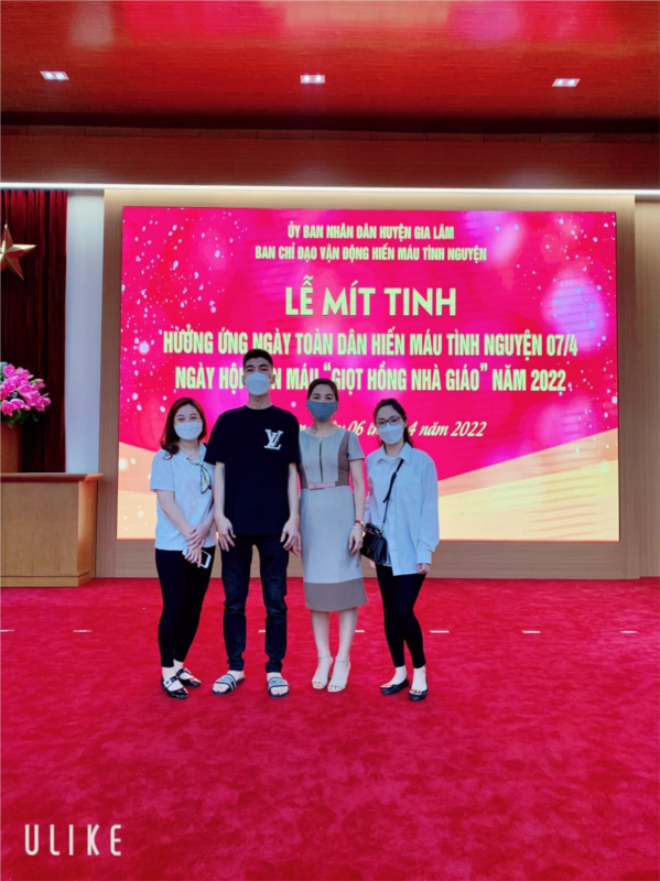 Thực hiện công văn số 03/CV-BCĐ ngày 30/03/2022 của UBND huyện Gia Lâm về việc vận động tham gia hiến máu tình nguyện năm 2022 với thông điệp “Giọt hồng nhà giáo năm 2022”, BCH công đoàn đã triển khai công văn, vận động trên tinh thần tự nguyện với các đồng chí cán bộ giáo viên, nhân viên nhà trường. Ngày 07/04/2022, trường đã có 04 đồng chí tham gia hoạt động nhân đạo này. Đây là lần thứ 2 trong năm học 2021 - 2022 trường THCS Kiêu Kỵ tham gia hiến máu tình nguyện.