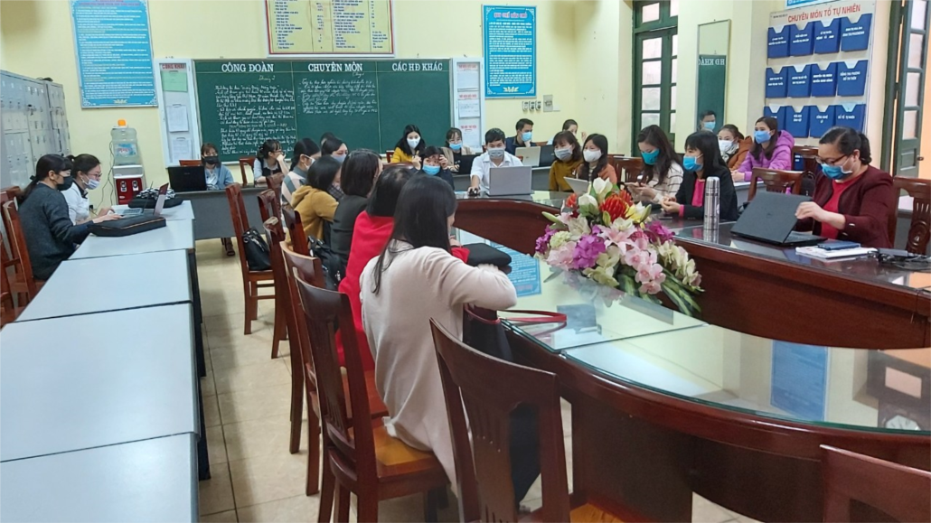 Trước tiên, đ/c Lê Thị Minh Thu hướng dẫn các đ/c giáo viên cách tải, cách cài đặt phần mềm, các tính năng của phần mềm và các bước soạn bài giảng, tạo các nhóm câu hỏi và cách ghi âm.... Sau đó, các nhóm trao đổi và thực hành một số các tính năng trong phần mềm E-learning. Qua buổi tập huấn, các đồng chí đã bước đầu biết cách cài đặt phần mềm, 1 số kỹ năng soạn bài. Trên cơ sở đó, các giáo viên về nhà tiếp tục nghiên cứu và tìm hiểu cách soạn bài giảng E-learning, cách cắt dán video đảm bảo cuối năm khảo sát 100% các đồng chí giáo viên biết làm thành thạo. Cũng trong buổi họp này, đ/c Nguyễn Thị Minh Hiền tiếp tục tuyên truyền tới toàn thể các đ/c cán bộ giáo viên, nhân viên nhà trường về tình hình dịch bệnh Covid-19, cách phòng dịch bệnh để đảm bảo sức khỏe cho bản thân, gia đình và cộng đồng. Toàn thể cán bộ, giáo viên, nhân viên trường THCS Kiêu Kỵ chung tay đẩy lùi dịch bệnh Covid-19.